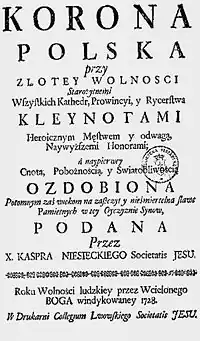 - Herbarz Polski (Polish Armorial) full title: "Korona Polska przy złotey wolnosci starożytnemi Rycerstwa Polskiego y Wielkiego Xięstwa Litewskiego kleynotami naywyższymi Honorami Heroicznym, Męstwem y odwagą, Wytworną Nauką a naypierwey Cnotą, nauką Pobożnością, y Swiątobliwością ozdobiona Potomnym zaś wiekom na zaszczyt y nieśmiertelną sławę Pamiętnych w tey Oyczyźnie Synow podana TOM ... Przez X. Kaspra Niesieckego Societatis Jesu", Lviv, 1738.