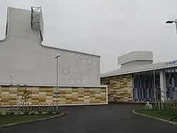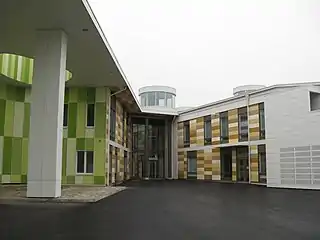 The construction costs of the community centre were around 42 million euros total with a Public-private partnership (PPP) of 25 years with the construction firm Lemminkäinen.[1] The building lies on a seven hectare property and its total area is around 23 000 gross square metres (35 650 071.3 square feet) and floor area measured at 24 588 square metres (264 663.029 square feet).[2] Construction on the community centre began in 2012 and was completed in 2014 when it was handed over for the city's operations and inauguration for the building was held later that year in November. The PPP with the city and the construction firm which includes the maintenance of the building is valid until 2039 and the deals total value is around 86 million euros. The bearing structures of the building are made out of concrete elements and exterior walls from wooden elements with colorful cement bonded fiberboards on top. Parking spaces include 200 parking spots for motor vehicles and 900 bicycle stand spots.