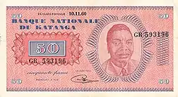 In 1961, a provisional issue of notes was produced by the government. These were overprinted on notes of the Ruanda-Urundi franc in denominations of 5, 10, 20, and 50 francs. On 9 January 1961, regular notes dated 31.10.60 were issued by the Banque Nationale du Katanga in denominations of 10, 20, 50, 100, 500 and 1000 francs. A second series of notes was also issued dated 1962 and 1963 in denominations of 100, 500, and 1000 francs.[3]