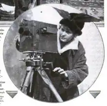 "I've had a varied experience with my pictures," she explained. "I've been up in a flying machine, have taken from tugboats and automobiles, and always there are plenty of bystanders ready and eager to jump in and play mob or be shot."[6] In 1916 she directed "Man and Millionaire", a film scenario written for a contest in the Pittsburgh Press.[7][8] In 1918 she completed Madame Spy, a film starring Jack Mulhall, Wadsworth Harris, George Gebhardt and Claire Du Brey.[9] She also advertised her services as available for documenting "children and social events ... factories and machinery."[10] She filmed the 1918 Memorial Day parade in Nutley, New Jersey.[11]