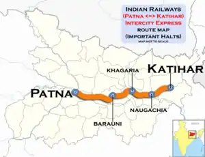 The 15713 / 14 Katihar - Patna Junction Intercity Express is an Express train belonging to Indian Railways Northeast Frontier Railway zone that runs between Katihar Junction and Patna Junction in India.