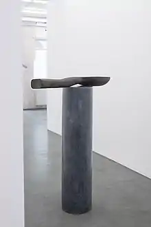 Much of her work is based on fluid movements – instead of breaking, chiseling or hacking, her materials are shaped, folded, cut, or simply placed in a context-specific constellation or construction. Bock prefers to integrate natural materials such as leather, wood, stone, fabric, plaster, ceramics or graphite, as well as individual found or otherwise unusual objects.[3] Katinka Bock’s repeated use of water in her works is not as much significant for the physical effects it produces, as it is for the symbolism it is charged with. Redirecting already occurring sources of water within both urban and rural landscapes, she builds structures that create a symbiotic relationship between the piece and the context in which it is placed. Incorporating rain water, water from public fountains, water from rivers or from the sea, the sculptures are animated, altered or adapted to the flow of the spaces which they interact with. One such example is the piece Hysteros, in which a wooden module placed in a Toulousian exhibition space is connected by a cable to the branch of a tree standing on a riverbed outside. The structure confined to the gallery moves up and down, reacting to the movement of the water current.[4]