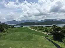 ![]() Kau Sai Chau and its golf course. Yim Tin Tsai and the breakwater are visible at the bottom right. The island at the centre right is Sharp Island. | |||||||||||||
