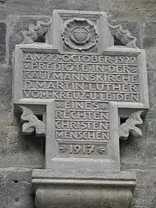 In 1917, the text Am 22. Oktober 1522 predigte in der Kaufmannskirche Martin Luther vom Kreuz und Leiden eines rechten Christenmenschen –1917– ("On 22 October 1522, Martin Luther preached in the Kaufmannskirche about the cross and suffering of a right Christian –1917–") was inserted into the outer church wall, in the direction of the Anger and the Martin Luther monument, in the form of a stone cross.