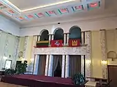 The hall has two balconies: one for the spectators and the other for the musicians. The balconies have bas-reliefs by Petras Rimša that depict four branches of the military.[3] The ceiling is 8 metres (26 ft) in height and features a coffer with tulips.[6] The white ceiling is illuminated with yellow, green and red lights – colors of the Lithuanian flag. Such lighting was installed when the building was built.[5] The columns are covered with marble, windows feature tulip motifs, and radiators are hidden by bronze grates. The black grand piano, made by Steinway & Sons in 1936, was likely gifted by the First Lady Sofija Smetonienė in 1939. Behind the grand piano, doors lead to a small winter garden that during the interwar period had a fountain.[6]