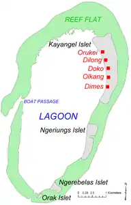 There are four densely wooded islets on the eastern and southern rim of the oval-shaped atoll, from north to south, are Kayangel, Ngeriungs, Ngerebelas and Orak.