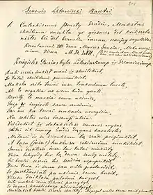 Jaunius studied the relationship between Indo-European languages and Finno-Ugric languages or Semitic.[49] He left notes for Lithuanian–Estonian (446 words) and Lithuanian–Finnish (474 words) etymological dictionaries. He also prepared a dictionary of loanwords of Baltic origin in the Finnish language (222 words).[59] He likely became interested in Finno-Ugric languages after reading a work of August Ahlqvist in 1878.[60] He claimed to have discovered equivalents of consonants in Proto-Indo-European and Proto-Semitic languages.[61] In his last decade, Jaunius was interested in many different topics and started many projects, but was unable to finish them.[62] A collection of his previously unpublished manuscripts was published in 1972.[63]