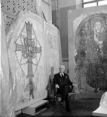 Faras, ancient Pachoras, was a capital city of the Northern Nubian kingdom. In 1961–1964 rescue excavations were performed there, headed by Professor Michałowski. The exploration was part of a larger project, named the Nubian Campaign, managed under the auspices of UNESCO, whose objective was to salvage historical artefacts from flooding by the Nile in connection to the Aswan High Dam development. Ruins of a medieval cathedral church of the bishops of Pachoras were discovered along with religious paintings dating back to the 7th – 13th century. A set of the so-called "frescos from Faras" (actually they are not frescos but paintings executed with tempera paint on dry plaster) comprising more than 150 paintings became one of the greatest and most interesting discoveries of the Nubian Campaign.[12] 67 paintings and fragments of stone decoration from the cathedral as well as other churches and buildings in Faras, epitaphs of local bishops and chaplains and local, artisanal products including pottery are stored in the Faras Gallery in Honour of Professor Kazimierz Michałowski in the National Museum in Warsaw.[13] Remaining historical objects discovered in Faras are contained within the holdings of the National Museum of Sudan in Khartoum.