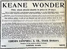 The location was discovered by a miner named Jack Keane. Keane and a partner named Domingo Etcharren had scouted the area, called Chloride Cliffs, and had located a potential silver mine. Etcharren eventually left while Keane stayed behind to scout the area more thoroughly. As Etcharren was leaving he noticed an outcropping of quartz, which can often be found near gold deposits. When Keane investigated further, he discovered gold. Keane named the find "Keane's Wonder" and the two miners quickly sold an option on the claim to a New Yorker named Joseph DeLamar.