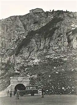 The Kehlsteinhaus (known in English as the Eagle's Nest) is a Nazi-constructed building erected atop the summit of the Kehlstein, a rocky outcrop that rises above Obersalzberg near the southeast German town of Berchtesgaden. It was used exclusively by members of the Nazi Party for government and social meetings. It was visited on 14 documented instances by Adolf Hitler.[1][2] Today, it is open seasonally as a restaurant, beer garden, and tourist site.