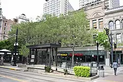 The Keith–O'Brien Building, behind trees the City Center TRAX station, May 2019