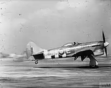 The squadron switched tactics at this time; casualties in No. 122 Wing's operations against ground targets had been high and it was decided that the Tempests would now carry out wide ranging sweeps, hunting out the Luftwaffe. No. 486 Squadron flew in support of the crossing of the Rhine on 23 March, dealing with anti-aircraft guns that were firing upon the Allied gliders involved in the operation.[19] From 10 April, the squadron began moving to the Rheine Airfield near Hopsten, within Germany itself. It became operational from there on 12 April. The following day, Taylor-Cannon led a flight of the squadron's Tempests in an attack on a German transport column along the east bank of the Elbe, at Dömitz. His aircraft was hit by flak and he bailed out.[3][20] According to Jim Sheddan, another pilot with the squadron, Taylor-Cannon's parachute was on fire and he landed heavily.[21] Accounts of what happened next vary; a British prisoner of war reported that Taylor-Cannon was wounded, taken away and subsequently died. Another was that he was murdered by German troops from the transport column that he had attacked. Regardless, despite postwar investigations into how he died, Taylor-Cannon's body was never located.[3][20]