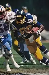 Less than three weeks after the draft, Winslow signed a series of one-year contracts to play for the Chargers. Coryell described him as "a big strong man who has great potential and ability," and suggested Winslow could play both tight end and wide receiver.[34] When the season began, Winslow did serve in both roles, being both the second tight end behind Klein and a third wide receiver behind Charlie Joiner and John Jefferson depending on the formation.[35] He caught his first career touchdown in week 2 of his rookie season, catching a 5-yard pass from quarterback Dan Fouts.[36] When an injury to Klein forced Winslow into the starting line-up, he responded with a seven-catch performance that left him as the Chargers' leader in receptions.[37] The following week, he lost a key fumble in a 7–0 defeat to the Denver Broncos.[38] A Los Angeles Times article described him as inconsistent, both as a blocker and a receiver, and "like a runaway locomotive without tracks" when carrying the ball.[39]