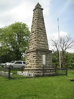 The monument was erected in 1887 and is constructed from native limestone, on its sides are three marble plaques. The apex of the monument is topped with a pyramid of cannonballs. It is 8 feet (2.4 m) square at its base and 3 feet (0.91 m) square at its top and stands 34 feet (10 m) tall.[3] At the foot of the monument is a small cemetery which contains the graves of militia men killed in four separate engagements during the Black Hawk War. The monument and cemetery are enclosed by a 15-by-25-foot (4.6 by 7.6 m) wrought iron fence.