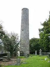 The Kells monastic site, including the Kells Round Tower, is associated with St Colmcille (also known as Columba), the Book of Kells, now kept at Trinity College, Dublin, and the Kells Crozier, exhibited at the British Museum. The round tower and five large Celtic crosses can still be viewed today. Four of the crosses are in the churchyard of St Columba's Church. The other Celtic cross was positioned in the middle of a busy crossroads until an accident involving a school bus. It now stands in front of a former courthouse. A roof protects the cross from the elements. A replica also stands safe from the elements inside the museum.