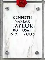 After contracting an illness from a hip surgery two years prior, Taylor died on November 25, 2006, of a strangulated hernia at an assisted living residence in Tucson, Arizona.[1][2] His son stated that he wanted "to be remembered mostly as a good father, husband, grandfather and great-grandfather. He was very loyal and dutiful, and to him that was more important than what he did in the war."[25] He was cremated and later buried at the Arlington National Cemetery in June 2007 with full military honors.[28] Alaska Senator Ted Stevens gave a eulogy at the United States Senate prior to the service at Arlington.[29]