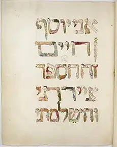 The manuscript was conceived as a work of art by Ibn Zabarah, that is the reason he hired Joseph ibn Hayyim, then the best European illuminator along with the German Jew Joel ben Simeon.[3][28] The original manuscript, made on high-quality parchment,[20] consists of 922 pages measuring 30 cm by 23.5 cm, of which 238 are illuminated in vivid colours and silver foil, with images rich in both detail and symbolism, making the manuscript a work of art unique with anthropomorphic and zoomorphic imagery, as well as emphasizing highly stylized and even abstract figures,[28] giving these miniatures an ornamental effect that increases with an ingenious background composed of a marginal border of red, blue and green arabesques, with occasional gold details.[31] A grammar compendium for students learning writing is laid out on the first 15 and the last 12 folios decorated with full-page illuminations. Most of the texts are set in architectural niches with illustrations having no relation to the texts. Sometimes the niches condition the extension of the texts, which may indicate that the former were made before the latter. The most ingenious ornaments are found in the Pentateuch, located at the beginning of each of the 54 parashiyot or sections into which the weekly reading of this volume is divided. According to Cecil Roth, in the Kennicott Bible ornament predominates over illustration, representing the triumph of conventionalism over convictions, and he points out that:[31]