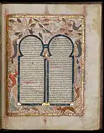 The Kennicott Bible (Galician: Biblia Kennicott or Biblia de Kennicott), also known as the First Kennicott Bible,[1] is an illuminated manuscript created in the city of A Coruña in 1476.[2] Written by the calligrapher Moses ibn Zabarah and illuminated by Joseph ibn Hayyim, this manuscript is considered by some, such as the historian Carlos Barros Guimeráns, the most important religious manuscript of medieval Galicia.[3] It is also regarded as one of the most exquisite illuminated manuscripts in Hebrew language in an article published by the Library of the University of Santiago de Compostela,[2] and the most lavishly illuminated Sephardic manuscript of the 15th century by Katrin Kogman-Appel.[4]