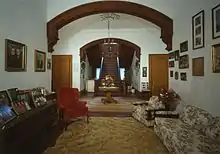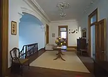 The ground floor features a 26-foot-long (7.9 m) by 13-foot-wide (4.0 m) entrance hall that is joined to form a T-shape with a cross hall at the back measuring 13 feet wide and 27 feet long. The cross hall is centered on the main oak staircase. Both halls employ large ornamental oak arches to visually define the spaces. The parlor is entered from the right side of the entrance hall and has an ornate plasterwork cornice with a central ceiling medallion. It measures roughly 18 by 26 feet. The sitting room is across the hall on the left and measures 18 by 18 feet. The octagonal library is entered from the east end of the cross hall. The library is furnished by a pair of built-in arched bookcases, features an elaborately molded plasterwork cornice, and measures roughly 18 by 22 feet. The dining room is on the opposite end of the cross hall and is the same size as the parlor. Other rooms on this floor include the smoking room, sewing room, a large butler's pantry and adjacent storage room.[3]