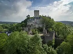 Kerpen Castle is built on a triple-terraced, hill spur, which is guarded to the north by a roughly 15-metre-wide neck ditch. The battlemented, 23-metre-high, bergfried stands on the first and highest terrace. On the top floor was once a dungeon.