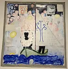 Marshall based several of his pieces in the early 1990s on actual events in American history. One such painting,Voyager,[29] painted in 1992, has special pertinence in a discussion of race issues in the United States because Marshall based it on a "luxury schooner ... secretly outfitted to carry African slaves".[17] Symbols of this representation abound, from the two black figures in the boat and the flowers draped around the woman's neck to the contrast between the light and airy clouds and the darkness of the upper background. A skull lies in the water, just beneath the ship, hinting at the doomed future of the Africans, and the unknown woman has an expression of uneasiness. He thus brings to the forefront the irony of a ship with a beautiful, high-class appearance and a dark secret purpose, forcing people to think about something they would rather forget.