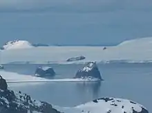 Kerseblept Nunatak (on the opposite coast of McFarlane Strait) from Lozen Nunatak, Livingston Island.