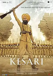 Kesari (transl. Saffron) is a 2019 Indian Hindi-language war film[3] written and directed by Anurag Singh. It was jointly produced by Aruna Bhatia, Karan Johar, Hiroo Yash Johar, Apoorva Mehta, and Sunir Khetarpal under the banners of Dharma Productions, Cape of Good Films, Azure Entertainment, and Zee Studios. The film stars Akshay Kumar with Parineeti Chopra, Vikram Singh Chauhan, Sarwar, Vansh Bhardwaj, Jaspreet Singh, Vivek Saini, Vikram Kochhar, and Rakesh Sharma in supporting roles. It follows the events leading to the Battle of Saragarhi, a battle between 21 Sikh[4] soldiers of the 36th Sikh Regiment of the British Indian Army and 10,000 Afridi and Orakzai Pashtun tribesmen in 1897.