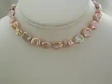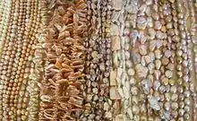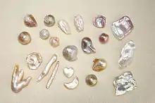 Keshi pearls are small non-nucleated pearls typically formed as by-products of pearl cultivation. A Japanese word also meaning "poppy" (ケシ, 芥子), it is used in Japanese for all pearls that grew without a nucleus. Originally, keshi pearls referred to those pearls formed when a bead nucleus was rejected. More recently, keshi has been used to refer to second harvest pearls and even to freshwater non-nucleated pearls. However the later usage referring to freshwater pearls is considered erroneous by many leading gem trade associations.[1] Because they have no nucleus, keshi pearls are composed entirely of nacre.