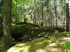 On the summit plateau are various rocks, named on hiking maps as the Gletschermulden, with striking round depressions in the Bunter sandstone of which they are composed. In addition to an unprovable theory that they were originally Celtic sacrifice bowls, there is also a theory that they are glacial potholes or mills. However, they would require a thick ice sheet to have covered the region and there is no evidence, such as glacial stria, anywhere in the Palatine region. It is thus questionable whether this could have been a periglacial site in the last ice age, as has been posited. A new interpretation suggests the depressions were simply formed by weathering processes in the various layers of sandstone.