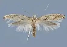 The length of the forewings is 6–7.3 mm for males and 5.1–6.1 mm for females. The forewings are white with light and dark brown scales. The hindwings are light brown. Adults are on wing from July to September.[2]