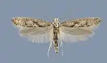 The length of the forewings is 8-9.2 mm for males and 6.7-8.1 mm for females. The forewings are grey. The hindwings are light grey. Adults have been recorded from mid to the end of July.[2]