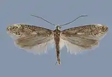 The length of the forewings is 7โ8.8 mm for males and 5.8โ6.3 mm for females. The forewings of the males are dark grey brown, mottled with whitish scales, particularly in the distal half, forming indistinct patches in the fold and on the costa at about four-fifths and irregular black dots on the veins and a few brown scales in the medial part of the wing. There is an oblique blackish fascia at about one-third to halfway. It is indistinct dark grey brown, mottled with whitish scales, particularly in the distal half, forming indistinct patches in the fold and on the costa at about four-fifths. There are also irregular black dots on the veins and a few brown scales in the medial part of the wing. The ground colour of the forewings of the females is whitish, mottled with black scales. Adults have been recorded on wing in late July.