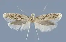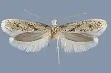 The length of the forewings is 6.4-7.7 mm for males and 5.5-6.5 mm for females. The forewings are white with light and dark brown scales. The hindwings are light grey. Adults are on wing from the end of June to the beginning of August.[2]