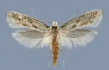 The length of the forewings is 6.7โ7.3 mm for males and 5.9โ6.6;mm for females. The forewings of the males are whitish-grey, intensively mottled with blackish-grey spots all over wing and a few ochre-brown scales in the dorsal part. There are blackish-grey patches at base of costa and at end of the cell and an oblique blackish-grey fascia at about one-third to halfway. The termen is whitish-grey. The hindwings are dark grey. The ground colour of the forewings of the females is whitish-grey, intensively mottled with blackish-grey spots all over the wing and with a few ochre-brown scales in the dorsal part. There are blackish-grey patches at the base of the costa and at the end of the cell and an oblique blackish-grey fascia at about one-third to halfway. The termen is whitish-grey. The hindwings are dark grey. Adults have been recorded on wing from late June to mid-August.
