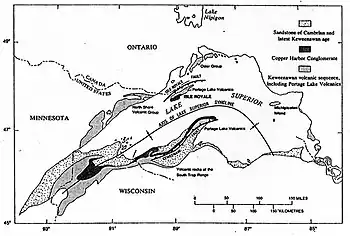The Keweenaw Fault is a reverse fault that bisects the Keweenaw Peninsula of the Upper Peninsula of Michigan.[1] The fault thrusts lava flows of the Midcontinent Rift System onto sedimentary rocks of the Jacobsville Sandstone. The fault is part of the inversion of the Midcontinent Rift where a region that had previously undergone extension experienced significant contraction. This contraction occurred during the final stages of the Grenvillian orogeny.[2] The Keweenaw Peninsula, itself, is the southeastern side of a large syncline beneath Lake Superior. The northwestern side forms Isle Royale.[3]