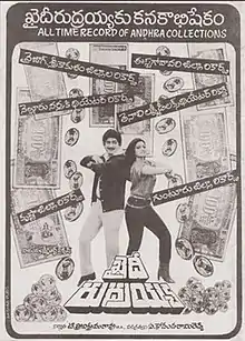 Khaidi Rudrayya (transl. Prisoner Rudrayya) is a 1986 Indian Telugu-language action drama film directed by A. Kodandarami Reddy who also wrote the screenplay for a story by Paruchuri Brothers; produced by T. Trivikrama Rao for Vijaya Lakshmi Art Pictures. The film stars Krishna in the title role alongside Sridevi and Sarada[4] with Rao Gopala Rao enacting the main antagonist. The film was recorded as a superhit at the box office.