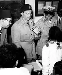 After Muhammad Naguib was made president, Mohieddine became a part of the Egyptian Revolutionary Command Council (RCC).[12] When army officers loyal to Nasser kidnapped Naguib in February 1954, Mohieddine unexpectedly ordered Naguib be released immediately and he was.[13] He explained the reason he took that action was because he felt Nasser and the Free Officers could not rule Egypt without Naguib.[11] Nasser, who was prime minister, responded to his move by dismissing all the officers loyal to him.[11] At the advice of his cousin and fellow RCC member, Zakaria Mohieddine, Khaled dropped out of sight for a few days after the protest, returning to Cairo on March 5.[11] The RCC members, including Mohieddine, agreed that he be sent to Europe as part of trade mission.[6] According to close sources, his parting with Nasser was sober but not devoid of "shared sorrow". The Egyptian regime designated him as a representative of the RCC abroad, leaving the impression that his informal exile was temporary.[6]