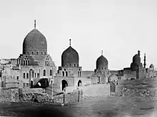 He apparently had a reputation simultaneously for being greedy and bad-tempered but also for being generous to the poor and to Sufis (the latter tendency being evident in this mausoleum and khanqah complex).[1] His reign was marked by relative security and stability, with few wars or rebellions. However, in 1427 he invaded Cyprus, captured its king (from the House of Lusignan) and forced him to pay tribute.[3] He also diverted the Indian Ocean trade routes through Jeddah (closer to Cairo) and introduced a state monopoly on sugar and pepper.[4][1] The revenues from this military victory and these trade policies may have helped him finance his construction projects, and may have encouraged him to build this new mausoleum complex in the Northern Cemetery later in his reign (after having already built a madrasa with attached mausoleum in the city center, mentioned above).[3]