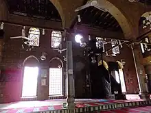 The mosque today also contains a minbar (pulpit next to the mihrab) that is sometimes cited as the most beautiful and accomplished work of its kind in Cairo.[1][3] Like most Mamluk minbars of the period it is made of wood and inlaid with ivory across a surface decorated with complex geometric star patterns. One detail that differs from other minbars of this type is that the geometric patterns have slightly curved lines instead of straight lines, subtly enhancing their visual effect.[3] The minbar originally belonged to the Mosque of al-Ghamri which was built in 1451 in the Bab al-Shari'a area of Cairo. It was moved to Barsbay's mosque when al-Ghamri's mosque was demolished in 1884.[4][1][5] The craftsman of the minbar is known from historical sources and is named as Ahmad ibn 'Isa al-Dimyati, who was also responsible for constructing minbars for the Mosque of Mecca and the later Mosque of Qijmas al-Ishaqi.[3][6] The construction of the minbar was originally financed by a merchant and scholar named Ibn al-Radadi.[6]