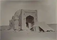Image from Aurel Stein's visit. A tomb (possibly a mosque) at the southeast corner, viewed from the east.
