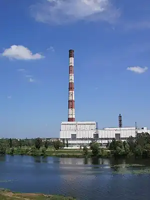 Kharkiv TEC-5 (Ukrainian: Харківська ТЕЦ-5) is a combined heat and power plant (CHP) near Podvirky village in Kharkiv Raion of Kharkiv Oblast, Ukraine. It is the second largest CHP plant in Ukraine.[1] It has a capacity of 540 MW of electric power[2] and up to 1,650 MW of heat power. It has a 330 meters (1,080 ft) tall chimney, built in 1979. There are also two 81 meters (266 ft) tall cooling towers.
