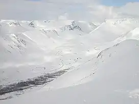The Khibiny Massif is of oval shape of about 1,300 km2. and occupies the central part of the peninsula at a relative elevation of 900–1000 m above the surrounding plain. The mountains are not particularly high; the two highest peaks are the Yudychvumchorr, which stands 1,201 metres (3,940 ft), and the Chasnachorr, which stands 1,191 metres (3,907 ft).[3] The average elevation is 1,116 metres (3,661 ft).[4] The mountains form the shape of a horseshoe topped by a high plateau, drained by a series of deep canyons. The peaks are of plateau type, with steep slopes, with glaciers, icefields and snowfields in some places. The overall terrain is alpine tundra.