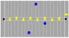 The field is 27 by 16 metres (89 by 52 ft), with a distance of 24 metres (79 ft) between the two poles, and the central lane having a width of 30 centimetres (12 in). Each of the cross lanes (which pass through the sitting areas that the chasers sit in, and go from one side of the court to the other) has a width of 35 centimetres (14 in), with adjacent cross lanes 2.3 metres (7 ft 7 in) apart, and a separation of 2.55 metres (8 ft 4 in) between each pole and its adjacent cross lane. Each pole is 120 to 125 centimetres (47 to 49 in) high and 9 to 10 centimetres (3.5 to 3.9 in) in diameter. The poles are smooth and round, with no sharp edges. There are 1.5 m (4 ft 11 in)-long extensions of the court behind each of the poles known as "free zones", in which there are no restrictions on chasers' movements.[4][19]