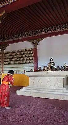 Inside the main prayer hall, a prostration is performed in front of the Buddha. There are two ways of prostration: a full one and none-full one.