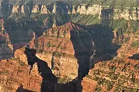 Kibbey Butte is a 7,801-foot-elevation (2,378-meter) summit located in the Grand Canyon, in Coconino County of northern Arizona, US.[2] It is situated two miles south of the Point Imperial viewpoint on the canyon's North Rim, where it towers over 3,000 feet (910 meters) above Nankoweap Canyon. Its nearest higher neighbor is Brady Peak one mile to the southeast, Hancock Butte is one mile to the north-northeast, and Alsap Butte is two miles to the east. The summit of this butte is composed of dark reddish Permian Hermit Shale overlaying the Pennsylvanian-Permian Supai Group, in turn overlaying the cliff-forming Mississippian Redwall Limestone.[4] According to the Köppen climate classification system, Kibbey Butte is located in a cold semi-arid climate zone.[5] Precipitation runoff from this feature drains east into the Colorado River via Nankoweap Creek. Cross-country access to Kibbey Butte starts at the parking area for Greenland Lake. The first ascent of the summit was made by Harvey Butchart and Allyn Cureton on May 31, 1961.