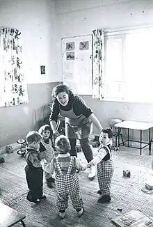 About three sextuplets comprised a kindergarten group, with their pre-school teacher and nanny. This was regarded as the children's home, which provided intimacy and close relations with peers. This is where they achieved their first level of socialization. Instead of rivalry, aggressiveness, and hatred, they were supposed to get an opportunity for cooperation, mutual support, and compassion.