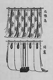 A kichō (几帳) is a portable multi-paneled silk partition supported by a T-pole.[1] It came into use in aristocratic households during and following the Heian period (794–1185) in Japan[2] when it became a standard piece of furniture.[3] Kichō are similar in appearance to a kabeshiro (壁代, wall-curtain), but are mounted on a free-standing stand rather than a lintel beam. They are less similar to noren, which do not include streamers to tie them up, and are generally used in different social settings.