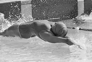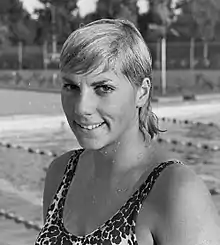 Christine "Kiki" Caron (born 10 July 1948 in Paris) is a French former backstroke swimmer. She won the silver medal in 100 m backstroke at the 1964 Summer Olympics and the gold medal in the same event at the 1966 European Aquatics Championships. She also participated in the 1968 Summer Olympics where she was the first woman to carry the French flag at the opening ceremony.[1] During her swimming career she won 29 national swimming titles.[2] Her elder sister Annie was also a swimmer and competed at the 1960 Olympics.[3]