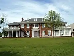 It is a large two-and-a-half-story Georgian Revival-style house with a hipped roof. It "is distinguished by its symmetrical massing and elaborate moldings. The five-bay central block, flanked by recessed three-bay wings, is centered by a segmentally curved pedimented portico with two fluted Doric columns and a fluted pilaster on each side."[2] It was designed by architects Warren-Knight and Davis, Inc., of Birmingham.[2]