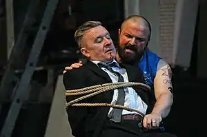 Kill Johnny Glendenning is written by Scottish playwright D C Jackson.[13] On 15 May 2014,[14] it was announced the play would premiere as part of the Lyceum Theatre's 2014-15 season[15] and would begin previews at the Royal Lyceum Theatre, Edinburgh on 17 September 2014, with an official opening night on 20 September, booking for a limited period until 11 October. Jackson had begun writing the piece two years earlier, without a commission, having feared it was unlikely to generate one due to a productions perceived cost, but also the creative freedom working without one allowed him as a playwright.[16] Lead casting for the production included Northern Irish actor and playwright David Ireland as Johnny Glendenning[17] and former River City actor Paul Samson as Andrew MacPherson.[18]
